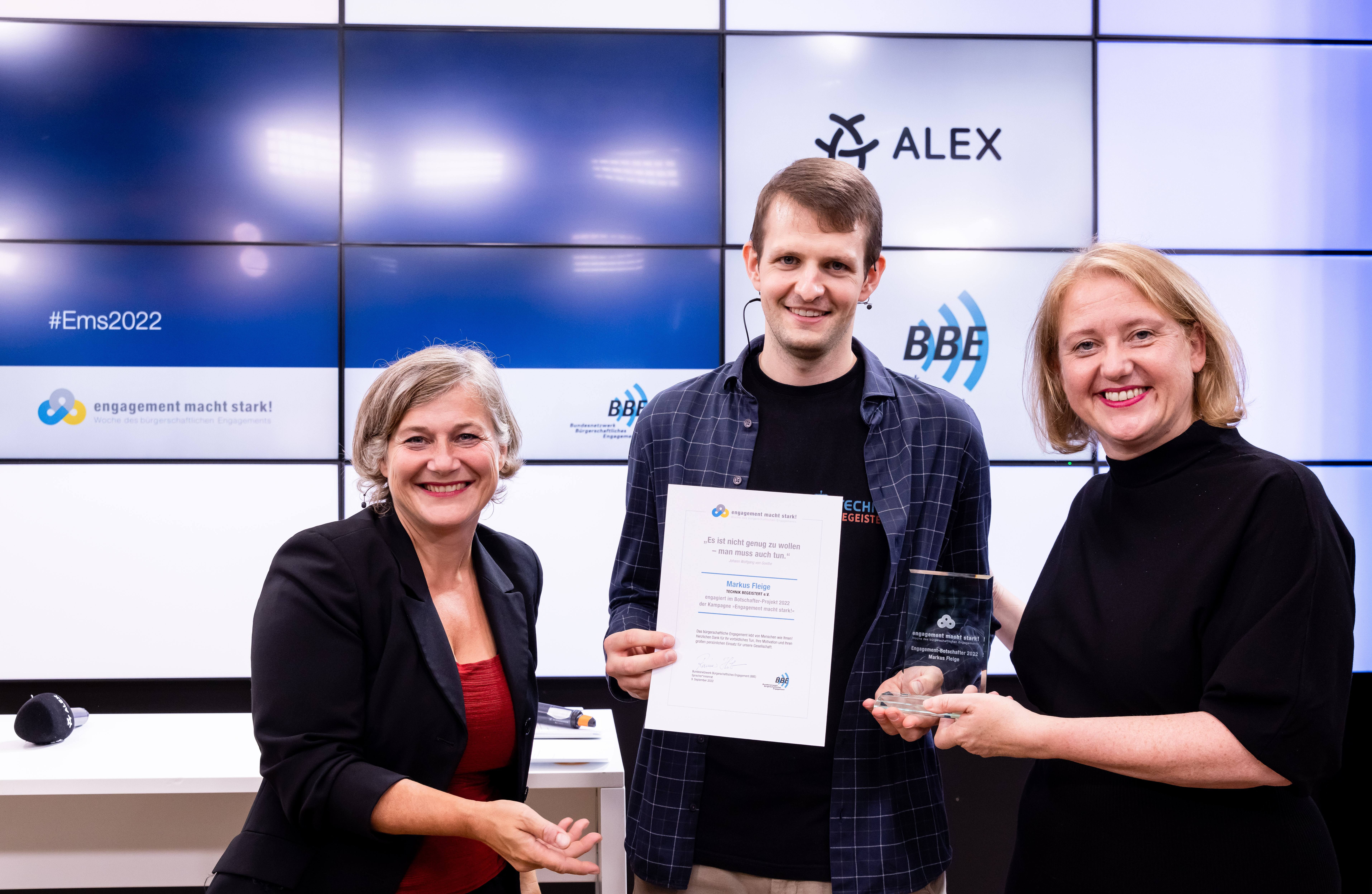 Zum Start der „Woche des bürgerschaftlichen Engagements“ wurde Markus Fleige, Vorsitzender von TECHNIK BEGEISTERT e.V., als Engagement-Botschafter für „Unternehmen und Zivilgesellschaft“ ausgezeichnet. Am Freitag nahm er die Ehrung, die zeitgleich eine Auszeichnung für die gesamte Vereins- und WRO-Community ist, aus den Händen der Bundesfamilienministerin Lisa Paus in Berlin entgegen.