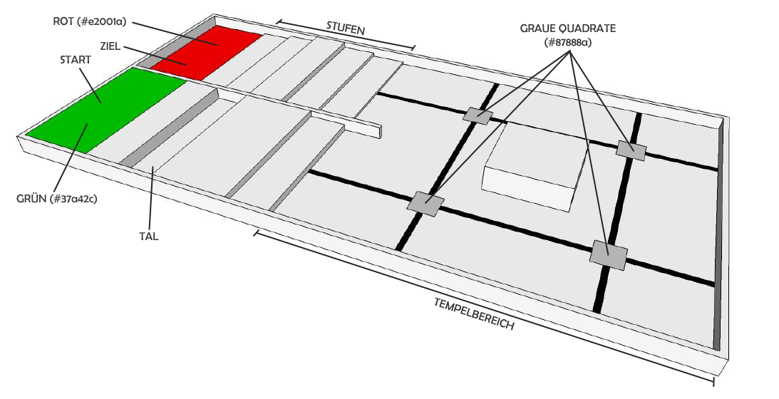 Der Roboter beginnt vollständig positioniert in der grünen Base und soll durch das Tal in den Tempelbereich fahren. Dort befinden sich drei graue Statuen und eine schwarze Statue, die sie jeweils im Inneren eines Würfels befinden. Es ist die Aufgabe, alle vier Würfel vollständig von den Statuen zu heben und außerhalb der grauen Quadrate zu platzieren.